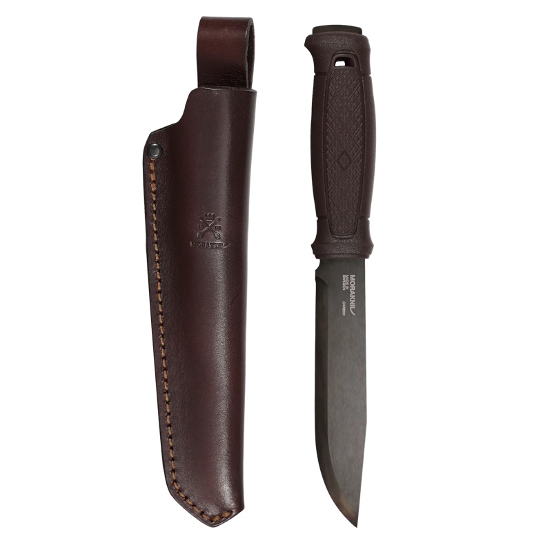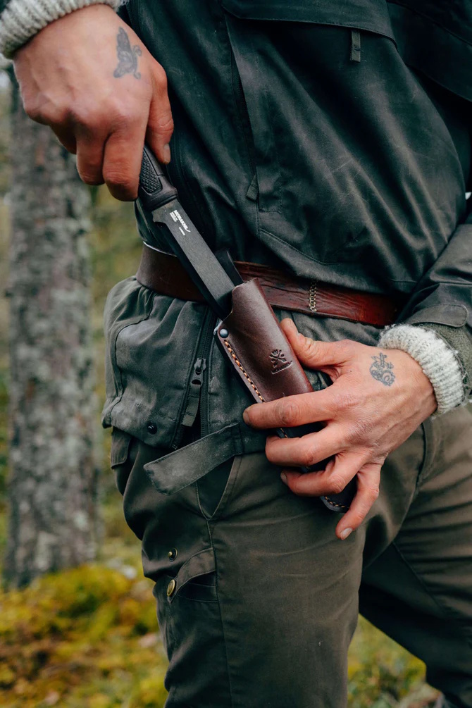 Tamnosmeđa drška je ergonomski oblikovana s Dala uzorkom trenja i štitnikom za prste, što osigurava čvrst hvat u svim vremenskim uvjetima. Nož dolazi s futrolom od europske kože biljnog štavljenja u smeđoj boji, opremljenom praktičnom omčom za remen.