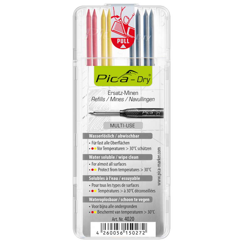 Pica Dry je profesionalni građevinski marker i prikladan je za gotovo sve materijale. Bilo da su suhe ili mokre, glatke ili hrapave, prašnjave ili zahrđale, zahvaljujući širokom rasponu grafita, savršeno ste opremljeni za svaki projekt.